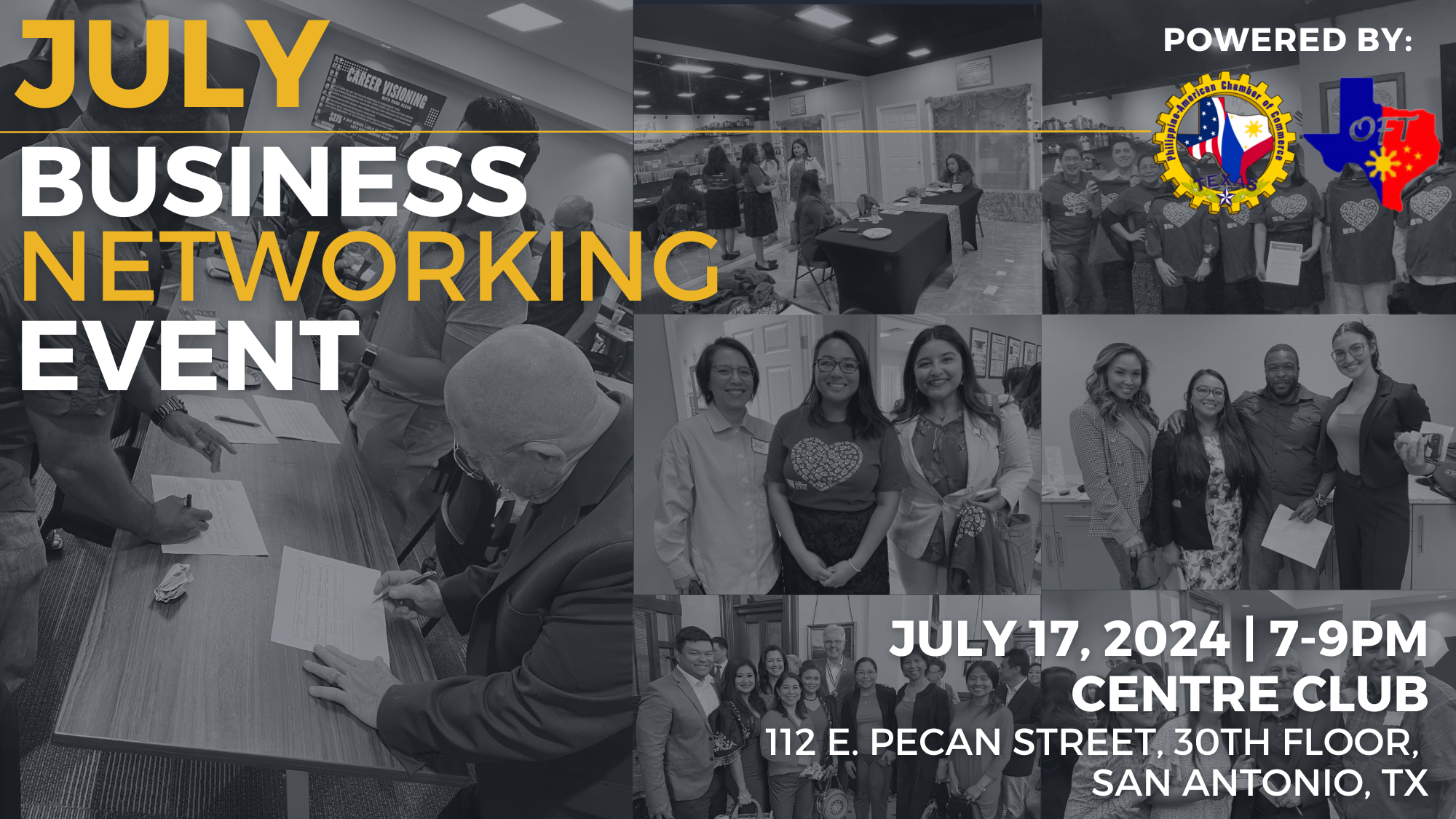 Join the Philippine American Chamber of Commerce-Greater San Antonio (PACC-GSA) and the Organization of Filipinos in Texas (OFT) for our July Business Networking Event! This informal evening is a perfect opportunity for entrepreneurs, business professionals, and community leaders to connect, collaborate, and cultivate meaningful relationships within the Filipino and Filipino-American community.